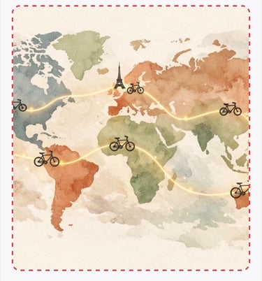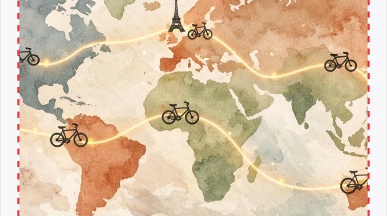 A jornada começará em Paris, atravessando Europa, África, Ásia, Oceania e Américas. Irei pedalar por todos os continentes vivenciando desafios e experiências imprevisíveis.